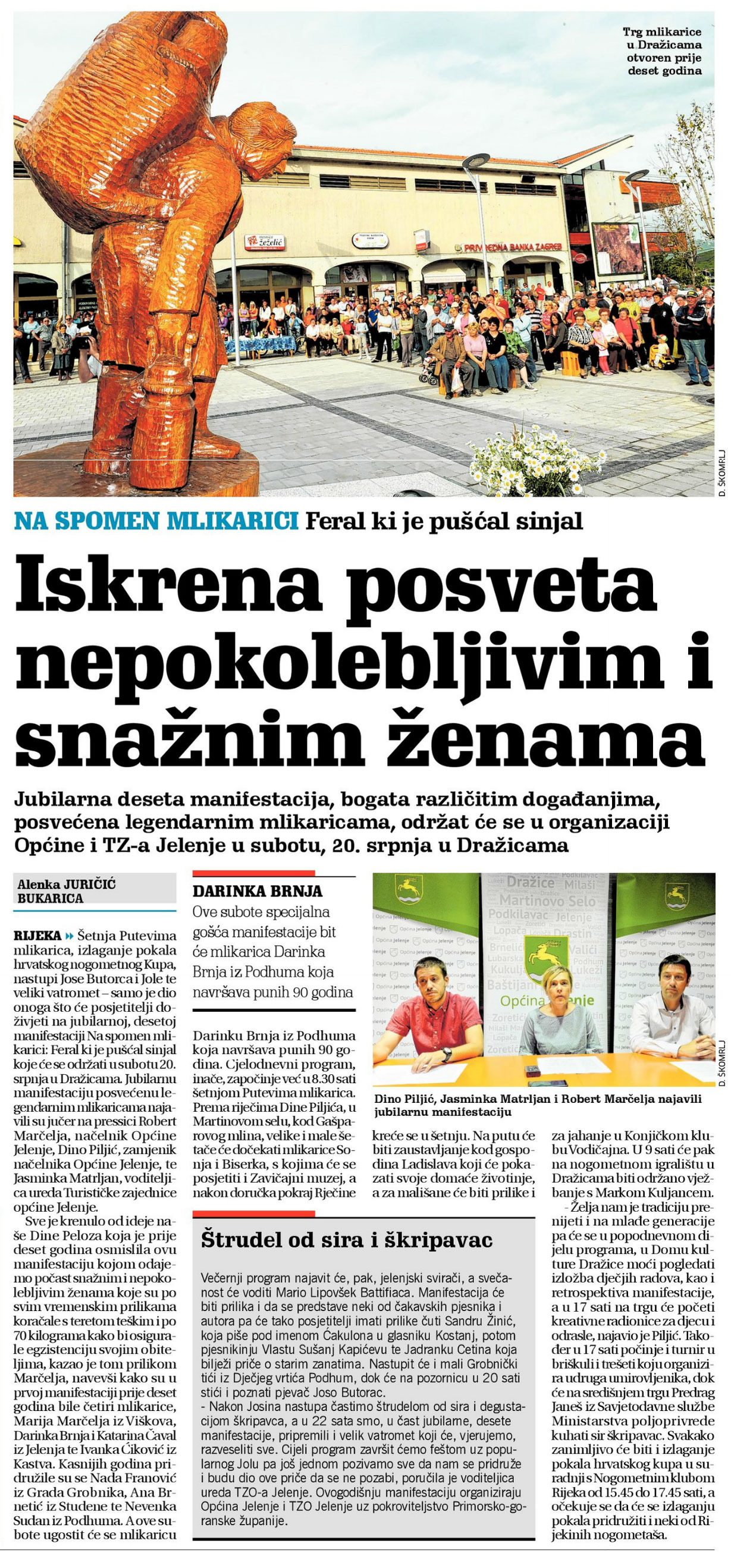 Ove subote u Dražicama održat će se deseto izdanje manifestacije pod nazivom: Na spomen mlikarici: "Feral ki j' pušćal sinjal". Cjelodnevnu manifestaciju i prigodan program najavili su danas na tiskovnoj konferenciji Robert Marčelja, načelnik Općine Jelenje, Dino Piljić, zamjenik načelnika Općine Jelenje, te Jasminka Matrljan, voditeljica ureda Turističke zajednice općine Jelenje.