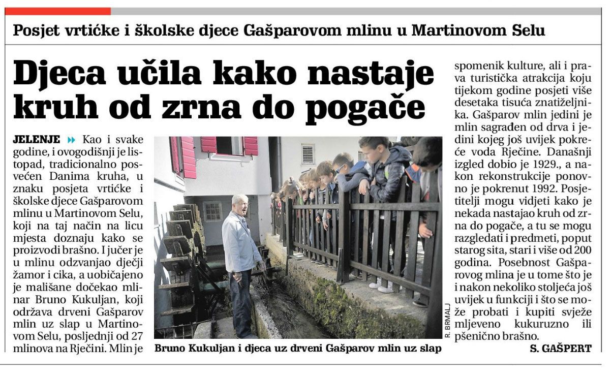 I jučer je u mlinu odzvanjao dječji žamor i cika, a uobičajeno je mališane dočekao mlinar Bruno Kukuljan, koji održava drveni Gašparov mlin uz slap u Martinovom Selu, posljednji od 27 mlinova na Rječini. Mlin je spomenik kulture, ali i prava turistička atrakcija koju tijekom godine posjeti više desetaka tisuća znatiželjnika. Gašparov mlin jedini je mlin sagrađen od drva i jedini kojeg još uvijek pokreće voda Rječine. Današnji izgled dobio je 1929., a nakon rekonstrukcije ponovno je pokrenut 1992. Posjetitelji mogu vidjeti kako je nekada nastajao kruh od zrna do pogače, a tu se mogu razgledati i predmeti, poput starog sita, stari i više od 200 godina. Posebnost Gašparovog mlina je u tome što je i nakon nekoliko stoljeća još uvijek u funkciji i što se može probati i kupiti svježe i mljeveno kukuruzno ili pšenično brašno.