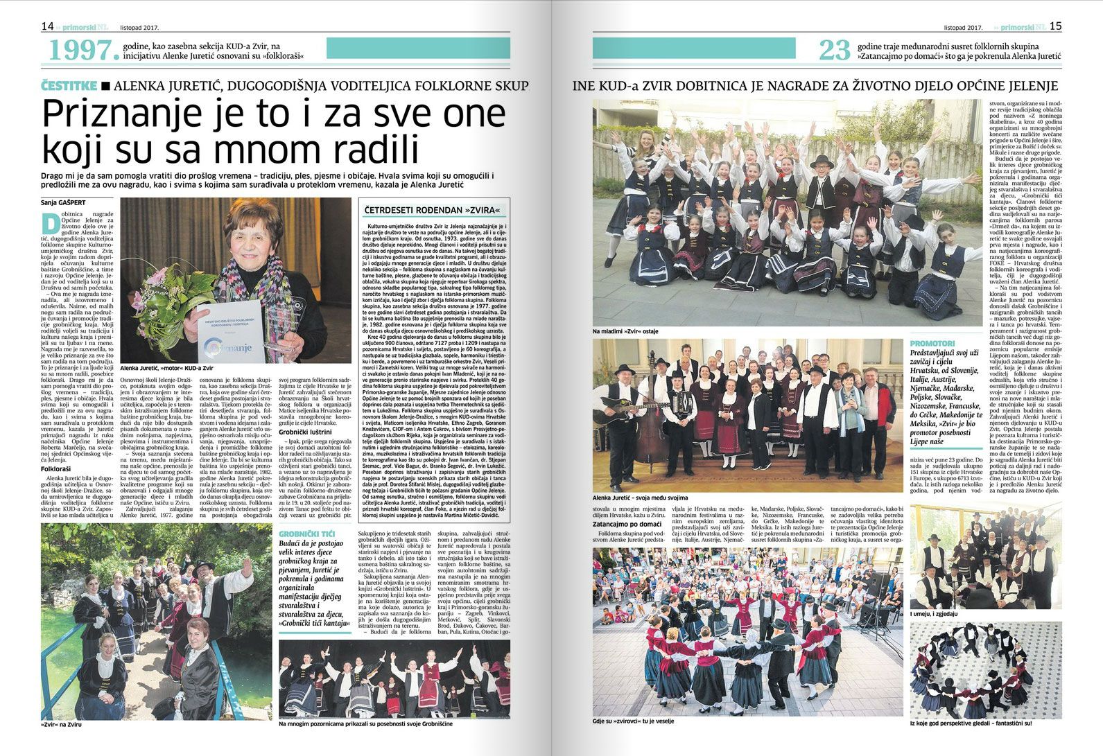 - Na tim natjecanjima folkloraši su pod vod tvom Alenke Juretić na pozornicu donosili dašak Grobnišćine i razigranih grobničkih tancih - mazurke, potresujke, vajsera i tanca po hrvatski. Temperament i razigranost grobničkih tancih već dugi niz godina folkloraši donose na pozornicu popularne emisije Lijepom našom, također zahvaljujući zalaganju Alenke Juretić, koja je i danas aktivni voditelj folklorne skupine odraslih, koja vrlo stručno i osmišljeno djeluje u društvu i svoje znanje i iskustvo prenosi na nove naraštaje i mlade stručnjake koji su stasali pod njenim budnim okom. Zahvaljujući Alenki Juretić i njenom djelovanju u KUD-u Zvir, Općina Jelenje postala je poznata kulturna i turistička destinacija Primorsko-goranske županije te se nadamo da će temelji i zidovi koje je sagradila Alenka Juretić biti poticaj za daljnji rad i nadogradnju za dobrobit naš Općine, ističu u KUD-u Zvir koji je i predložio Alenku Juretić za nagradu za životno djelo.