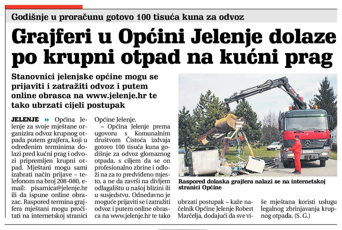 Općina Jelenje za svoje mještane organizira odvoz krupnog ot-pada putem grajfera, koji u određenim terminima dolazi pred kućni prag i odvozi pripremljen krupni otpad. Mještani mogu sami izabrati način prijave - telefonom na broj 208-080, e-mail: pisamica@jelenje.hr ili da ispune online obrazac. Raspored termina grajfera mještani mogu pročitati na internetskoj stranici Općine Jelenje.