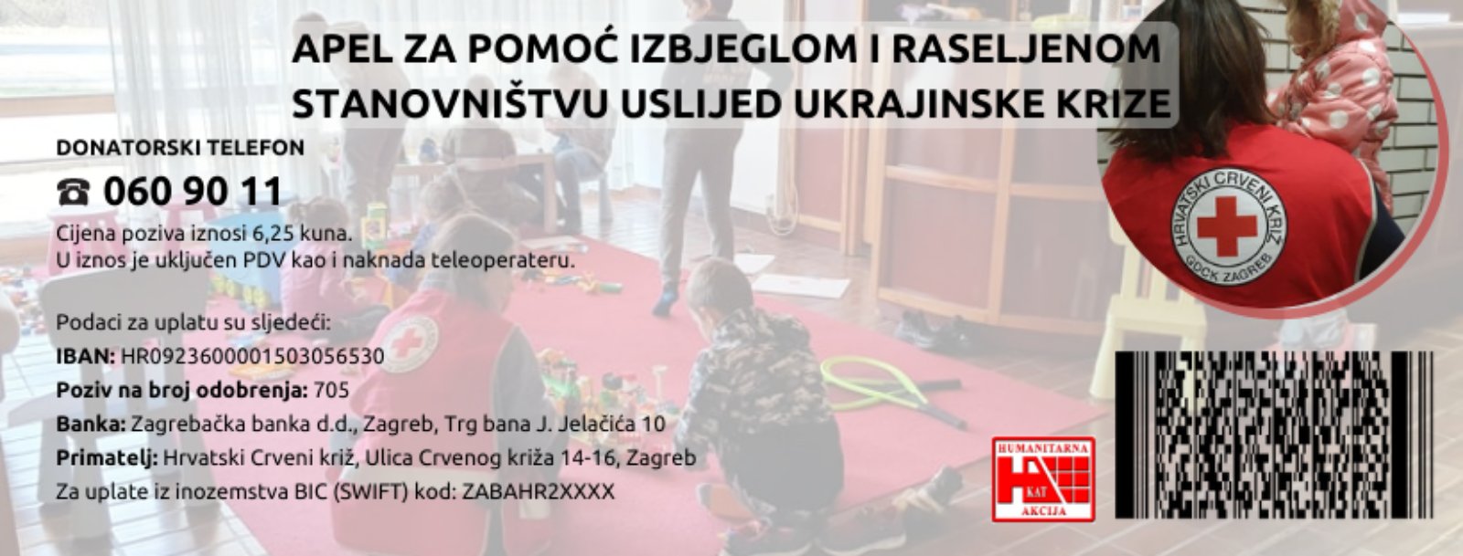 Hrvatski Crveni križ otvorio je i humanitarni telefon i apel za pomoć izbjeglicama iz Ukrajine te svi koji žele pomoći mogu to učiniti pozivom na telefon ili uplatom na žiro-račun.