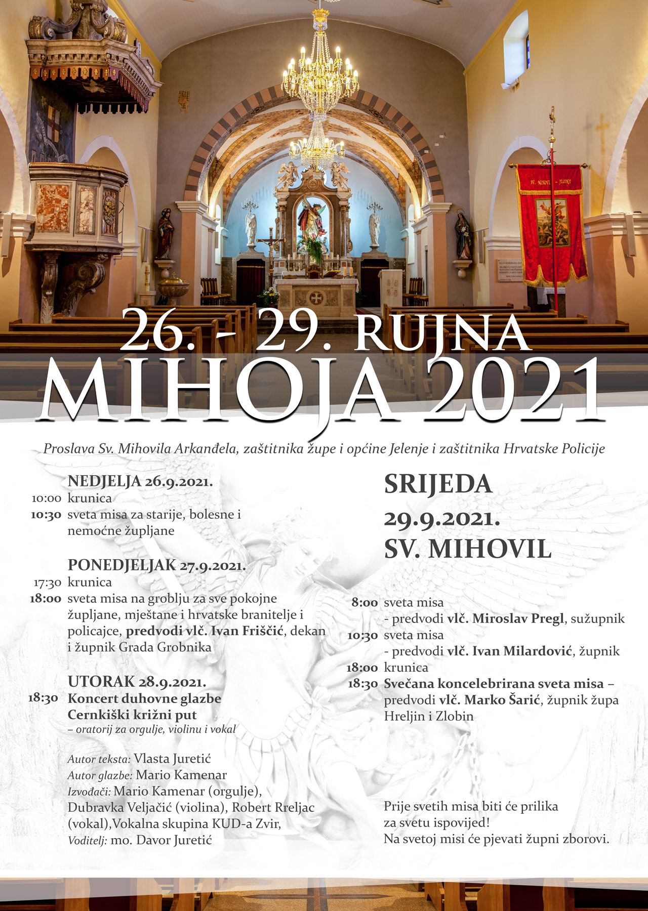 U srijedu 29. rujna, na sam blagdan sv. Mihovila, jutarnju misu u 8 sati predvodi sužupnik vlč. Miroslav Pergl. Sv. Misu u 10.30 sati vlč. Ivan Milardović. U 18 sati je molitva krunica, a svečanu koncelebriranu misu u 18.30 sati predvodit će vlč. Marko Šarić, župnik župa Hreljin i Zlobin. Prije svetih misa bit će prilika za svetu ispovjed, a na svetim misama pjevat će župni zborovi. Nakon svečane koncelebrirane mise bit će skromno druženje prilagođeno epidemiološkim uvjetima za sve župljane i mještane koji budu prisutni.