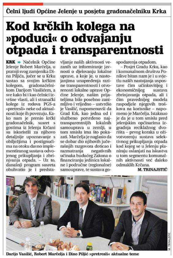- Posjet Gradu Krku, kao i komunalnom društvu Ponikve bitan nam je i u svjetlu naših nastojanja uspostave čim učinkovitijeg i ekonomičnijeg sustava zbrinjavanja otpada, ali i čim pravednijeg modela raspodjele njegovih troškova na korisnike - napomeno je Marčelja. istaknuo je da je u tom smislu pred jelenjskim općinarima izgradnja reciklažnog dvorišta - prvog koraka u osvotvorenju susrava selektivnog prikupljanja otpada kod kojeg se u Jelenju planiraju oslanjati na iskustva u tom segmentu komunalnih aktivnosti već daleko odmaklih Krčana.
