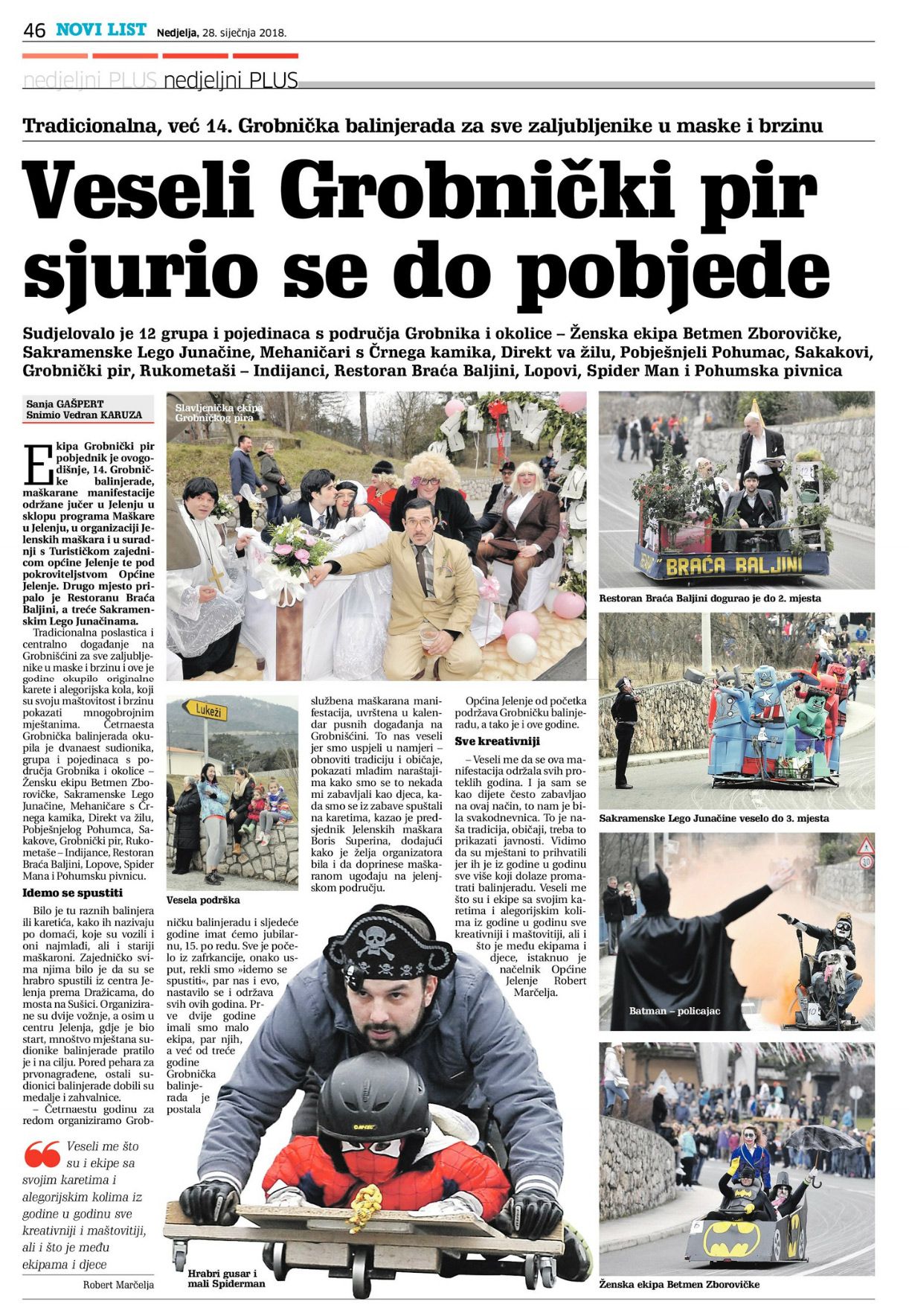 - Veseli me da se ova manifestacija održala svih proteklih godina. I ja sam se kao dijete često zabavljao na ovaj način, to nam je bila svakodnevnica. To je naša tradicija, običaji, treba to prikazati javnosti. Vidimo da su mještani to prihvatili jer ih je iz godine u godinu sve više koji dolaze promatrati balinjeradu. Veseli me što su i ekipe sa svojim karetima i alegorijskim kolima iz godine u godinu sve kreativniji i maštovitiji, ali i što je među ekipama i djece, istaknuo je načelnik Općine Jelenje Robert Marčelja.